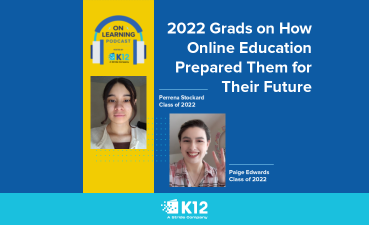 In this podcast episode of “K12 On Learning,” you will hear from two high school graduates… Perrena Stockard, a graduating senior from Indiana Digital Learning School, and Paige Edwards, a graduating senior from Destinations Career Academy in Oregon. Paige Edwards is also a member of the Stride Student Advisory Council. Both graduates are addressing their peers at their own school’s graduation ceremony, and both of them have a lot to say about their online education. Listen now!